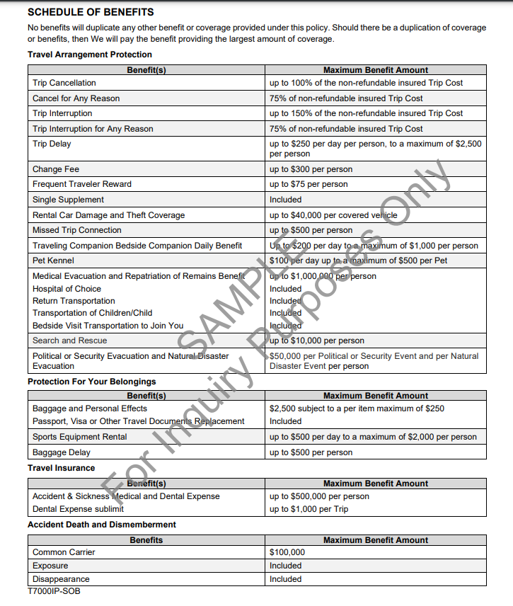 Available as optional buy-up if purchased within 20 days of initial trip payment or 75% of non-refundable trip cost |
